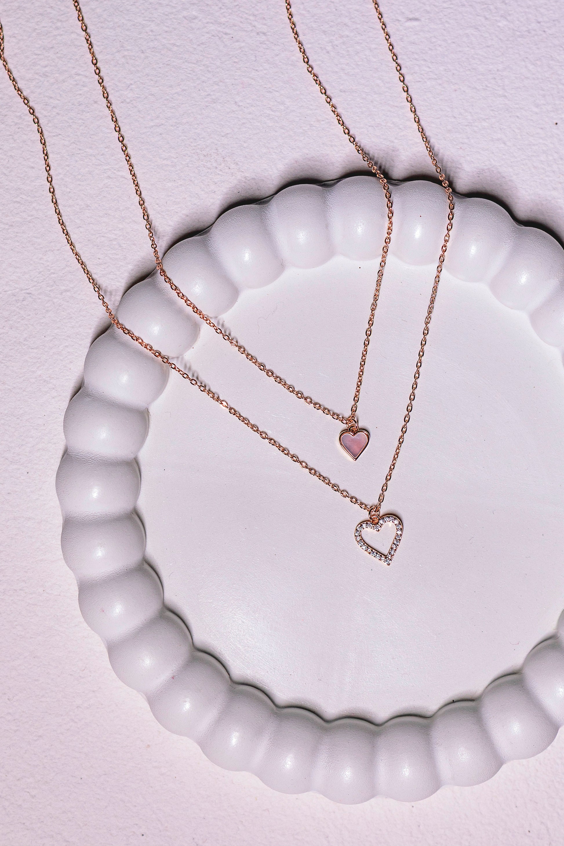 Fall in love with layers. This delicate necklace features two heart pendants – one classic, one sparkling – for a sweet, modern touch. This necklace deserves a place in your heart and your jewellery box.